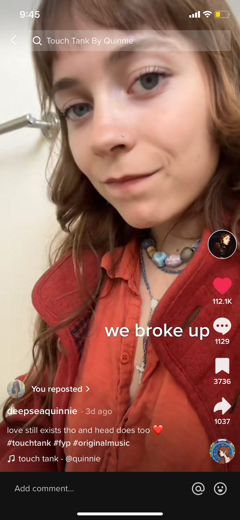 But whatās even more interesting is that on quinnieās TikTok announcing her split, hundreds of comments remarked about the partner they had once dedicated this song to were no longer in their lives either - some have called it the touch tank curse.